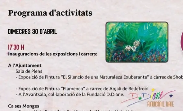 El pasado 1 de mayo del 2025, durante la feria de la flor, se ha realizado en Costitx (Mallorca) y promovida por la Fundación D.Diane una exposición de pintura bajo el titulo “El silencio de una naturaleza exuberante” de Shobana Tyroller. Fueron muchas las personas que pudieron disfrutar de las obras de esta gran artista nacida en Bélgica en 1947. Con una temática basada en la naturaleza Shobana transmite su vigorosa energía al espectador mediante el color y las formas, materializando su visión de la propia naturaleza que le rodea. La artista que ya ha expuesto en muchas galerías y en países como Alemania, Luxemburgo, Bélgica, Francia o España por citar algunos nos presenta una parte de la línea existencial de la propia naturaleza que la envuelve y motiva.